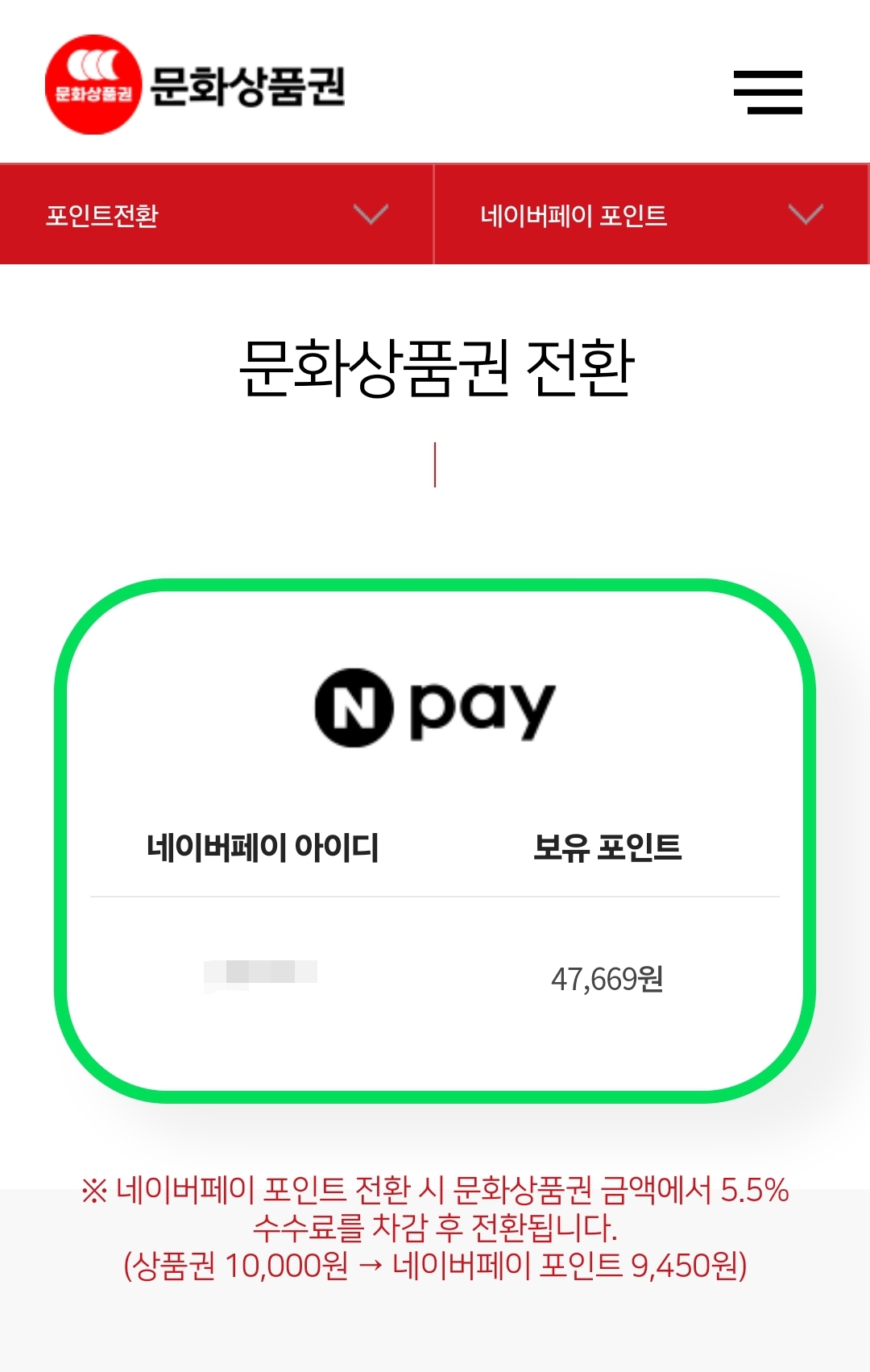 다시 온라인 문화상품권으로 들어가 '온라인 문화상품권네이버페이 전환하기' 화면을 찾아주세요.